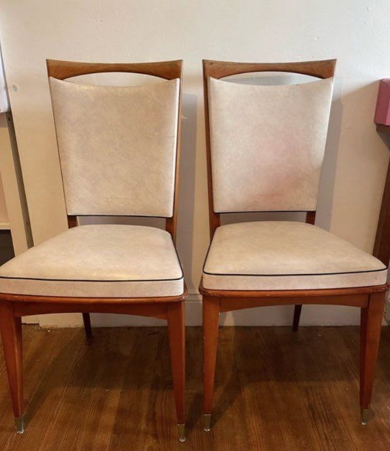 Due sedie anni '50 in similpelle beige con struttura in legno. Gambe in metallo (solo anteriori). Altezza totale: - 94 cm - Altezza seduta: 47 cm. Prezzo: 69 € per la coppia.
