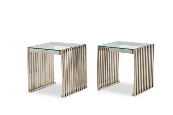 Coppia di tavolini o comodini in metallo cromato. Anni '70.