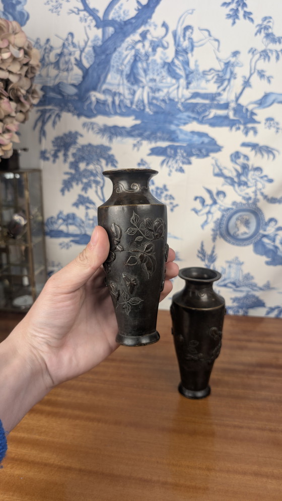 Gli appassionati di bronzi giapponesi o i collezionisti di curiosità asiatiche non aspettino oltre e ordinino senza indugio questa coppia di vasi in bronzo Meiji, che non si limitano a decorare uno spazio: aggiungono un tocco di silenzio, grazia ed eternità.