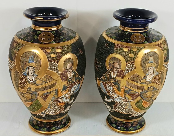 I vasi presentano un'intricata raffigurazione dipinta a mano dell'Imperatore e dell'Imperatrice, circondati da Draghi Imperiali in altorilievo, eseguiti con la prestigiosa tecnica Moriage. Il livello di dettaglio dei volti e la texture a strati delle squame sono un segno distintivo della bottega Niiyama.