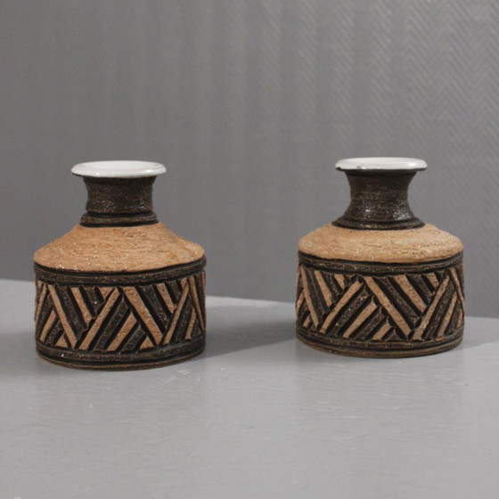 Coppia di vasi vintage in ceramica, argilla chamotte, decoro geometrico, Italia, anni '70