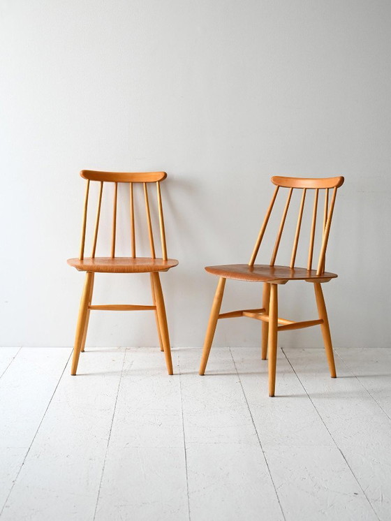 Coppia originale di sedie Fanett disegnate da Ilmari Tapiovaara, prodotte in Danimarca tra il 1950 e il 1959. Realizzate in faggio naturale, presentano gambe tornite e uno schienale con sei fusi leggermente angolati. Un design equilibrato, emblema del funzionalismo scandinavo di metà secolo. L'etichetta originale del produttore è conservata sotto la seduta.