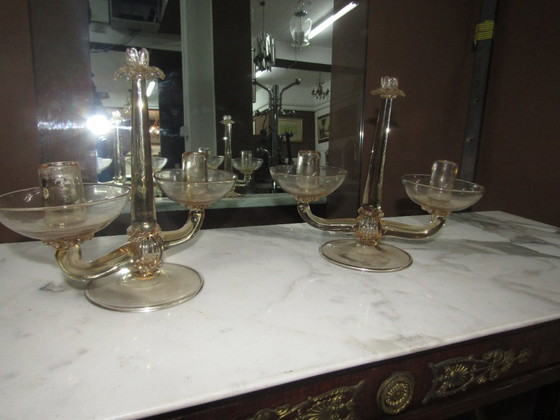 Questa splendida coppia di portacandele Salviati in vetro di Murano rappresenta un esempio raffinato di artigianato veneziano. Con il loro design elegante e le tonalità dorate, questi portacandele aggiungono un tocco di lusso e storia a qualsiasi ambiente.