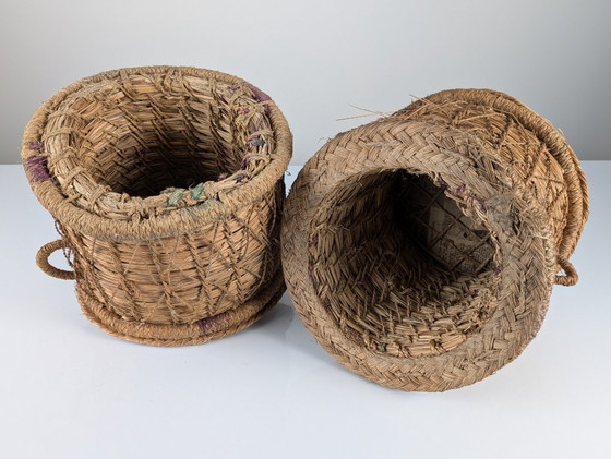 Realizzati a mano nella soleggiata Andalusia negli anni '60, questi cestini rustici esemplificano le tradizioni senza tempo della cesteria vernacolare spagnola. Sapientemente intrecciati con il resistente sparto locale, questi robusti contenitori presentano la tecnica autentica originariamente concepita per un uso pratico in campagna. Pur richiamando il design delle grandi bisacce da asino utilizzate per il trasporto di carichi pesanti, queste dimensioni ridotte erano probabilmente destinate alla raccolta manuale delle olive o alla conservazione di piccoli oggetti domestici. Il design presenta un robusto manico intrecciato spesso e una fitta trama strutturale, in grado di resistere all'uso quotidiano. Rispecchiando lo stile di vita rurale della Spagna meridionale a metà del XX secolo, offrono una ricca qualità materica e un carattere artigianale che gli articoli prodotti in serie non possono replicare. Oggi, fungono da eccezionali elementi decorativi per riporre fiori secchi, articoli da toeletta o piccoli tessuti, infondendo agli interni moderni il calore dei materiali organici e l'estetica genuina della campagna mediterranea.