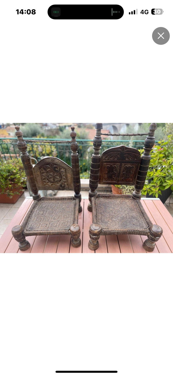 Questa coppia di sedie antiche tradizionali indiane in legno di scultura è un ottimo esempio di artigianato classico. Realizzate in legno con sedili in rattan, presentano intricati disegni intagliati sullo schienale. Perfette per aggiungere un tocco di autenticità e fascino a qualsiasi interno, queste sedie sono ideali per gli amanti dei mobili vintage.