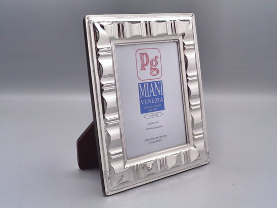 Cornice portaritratti in argento massiccio 925 lavorata e sbalzata a mano - peso grammi 217 - peso del solo argento 925 utilizzato grammi 36 - altezza cm.17 - larghezza cm.14 - misura interna per foto cm.8,5x11,5 - la fascia d'argento misura cm.3 di larghezza - si può mettere in verticale e in orizzontale - schienale in vero legno di betulla tinto mogano - argento fissato con dei piccoli chiodini e punzonato con marchio di stato 193VE e titolo 925 - prodotta artigianalmente negli anni 2010/2020 dall'Argenteria PG-MIANI di VENEZIA - garanzia allegata - spedizione con corriere espresso e tracciabilità