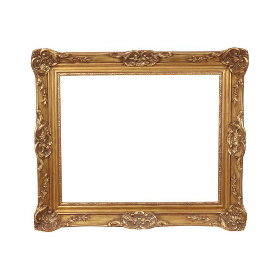 Bella cornice classica dorata, interamente in tipico stile barocco, elegantemente decorata con foglie d'acanto, viticci, fiori e motivi a nastro, in pino e gesso, circa metà del XX secolo.