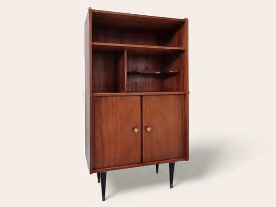 Questo elegante mobile pensile ha un look scandinavo naturale grazie al suo design raffinato e all'utilizzo di impiallacciatura di teak di alta qualità. Le gambe coniche rotonde in legno nero con piedini in ottone conferiscono al mobile ulteriore carattere ed eleganza. Anche le maniglie in ottone contribuiscono a un aspetto lussuoso.