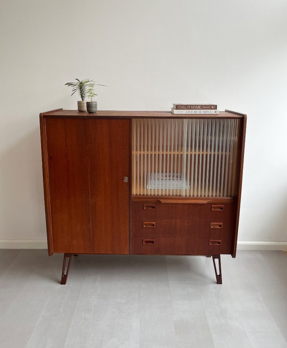 Questa credenza/mobiletto anni '60, realizzata in teak, è una vera bellezza. Presenta ante scorrevoli in vetro, tre cassetti, un ripiano estraibile in formica bianco/grigio e un'anta con due ripiani. Chiave inclusa. E quelle gambe sono fantastiche! In buone condizioni vintage.