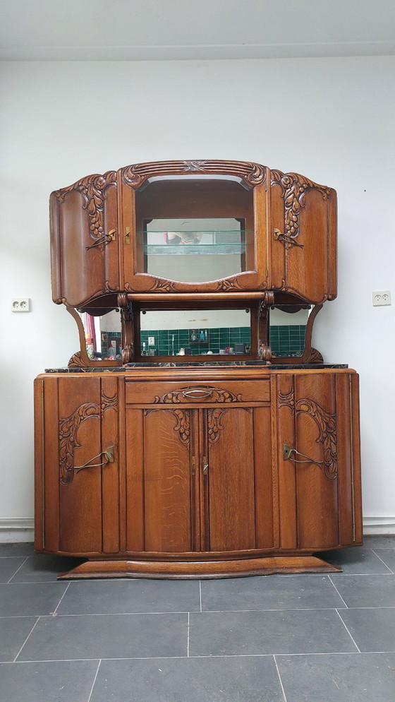 Immergetevi nell'eleganza dell'Art Déco con questa squisita credenza, un vero capolavoro di design e funzionalità. La sua pregiata struttura in legno è impreziosita da intricati intagli, perfettamente completata da un lussuoso piano in marmo che aggiunge un tocco di raffinatezza a qualsiasi ambiente. Il retro a specchio e la parte frontale in vetro offrono uno spazio ideale per esporre i vostri oggetti da collezione o le vostre stoviglie più pregiate.