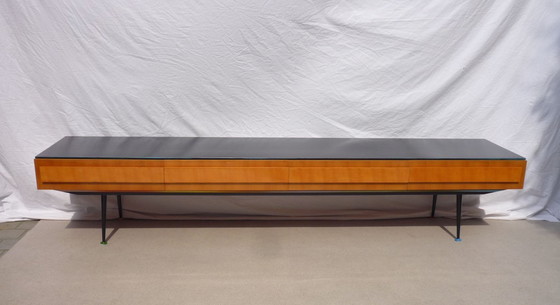Credenza bassa vintage su 4 gambe in metallo (laccate con vernice epossidica e rotella di regolazione) 4 cassetti con maniglia in legno, colore interno Piano superiore laccato PU nero opaco Lati in legno verniciato come i cassetti Parte posteriore laminata nera lucida, che consente la libera installazione, ad esempio al centro di una stanza Le gambe possono essere rimosse per il trasporto