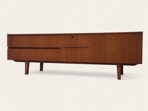 Splendida credenza bassa di metà secolo, risalente agli anni '60, realizzata in pregiato teak impiallacciato. Il design elegante e funzionale e le calde tonalità del legno conferiscono al mobile un naturale look scandinavo. Le gambe in legno squadrate e affusolate aggiungono eleganza e raffinatezza.