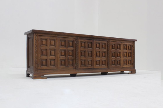 Credenza brutalista spagnola vintage in legno massello degli anni '60. Splendidamente progettata con motivi grafici a quadrati.