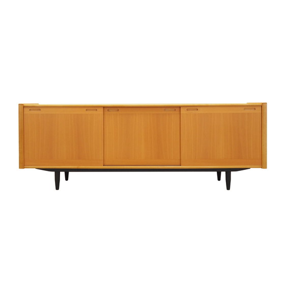 La credenza è stata realizzata negli anni '70, prodotta dalla nota manifattura danese Skovby Møbelfabrik. La struttura è rivestita in impiallacciatura di faggio. Le gambe sono in legno massello tinto nero. Superficie dopo il restauro. All'interno, lo spazio è stato riempito con due ripiani regolabili in altezza e due capienti cassetti. L'uso di ante scorrevoli riduce la necessità di lasciare un ampio spazio libero davanti al mobile, senza limitare l'accesso all'interno. Inoltre, le ante scorrevoli sono ideali per utilizzare il mobile sotto apparecchiature audio. Condizioni: Superficie restaurata. Sono visibili piccoli graffi e perdite di impiallacciatura restaurata. I segni d'uso più estesi sono sempre visibili nelle foto. Prodotto pronto all'uso. *Per motivi di sicurezza, il mobile potrebbe avere le gambe svitate e le ante scorrevoli e i ripiani rimossi per essere trasportato. Il montaggio non dovrebbe essere un problema. In caso di dubbi, contattateci e vi invieremo un video didattico. Dati tecnici: Altezza: 69 cm Larghezza: 195 cm Profondità: 49 cm
