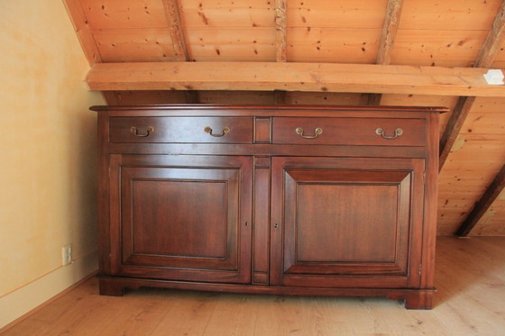 Elegante credenza in mogano con due ante e due cassetti, perfetta per riporre oggetti. La calda tonalità del legno e le maniglie classiche creano un look senza tempo. Ideale sia per interni tradizionali che moderni.
