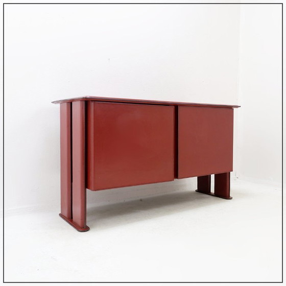Materiali: Pelle bordeaux, metallo e struttura in legno. Il mobile è rivestito in pelle con cuciture decorative.