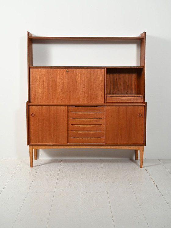 Credenza in teak con libreria integrata, prodotta da Brantorps negli anni '50-'60, con anta a ribalta.