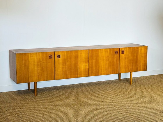 Credenza vintage scandinava in teak risalente agli anni '60, con quattro ante con ripiani minimalisti.