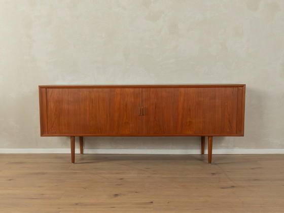 Credenza classica degli anni '60 di Svend Aage Larsen per Faarup Møbler. Il corpo è realizzato in impiallacciato di teak con due ante a tamburo, quattro cassetti interni, due ripiani e piedi a forma di sigaro. Il piano è rivestito in formica nera. Le caratteristiche di qualità includono un design accurato con proporzioni perfette e una visibile attenzione ai dettagli, una lavorazione di alta qualità con materiali di prima scelta, un corpo con bordo in legno massiccio e ante con maniglie in legno massiccio. Prodotto in Danimarca. Design: Svend Aage Larsen, produttore: Faarup Møbler.