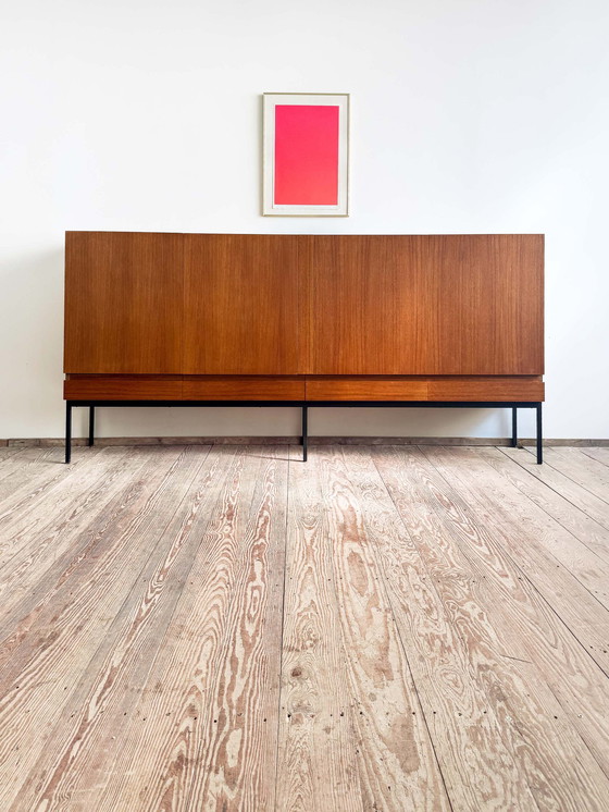 Dimensioni 248 x 43 x 119 cm (L x P x A) Elegante credenza dalle dimensioni ridotte della serie B di Behr, progettata da Dieter Waeckerlin alla fine degli anni '50. Quattro cassetti e due ampi scomparti con numerosi ripiani. L'esterno del mobile è realizzato in impiallacciatura di teak a venature uniformi e l'interno è rivestito in impiallacciatura di acero. La credenza dalle eleganti proporzioni poggia su una struttura in acciaio nero. Ottime condizioni di restauro. Il mobile è stato appena verniciato e mostra solo pochi segni di usura all'esterno, come piccoli graffi e urti, e qualche abrasione sulla struttura. All'interno sono presenti alcune macchie più evidenti e segni di usura colorati. Altezza: 47 pollici (119 cm) Larghezza: 98 pollici (248 cm) Profondità: 17 pollici (43 cm) Elegante credenza di Dieter Wäckerlin con base in metallo nero. Intarsio in acero. Esterno impiallacciato in teak. Ampio spazio con quattro cassetti e numerosi ripiani interni. Waeckerlin era un ebanista, architetto d'interni e designer di mobili svizzero. I suoi mobili di metà secolo sono caratterizzati da un linguaggio formale purista, particolarmente evidente nelle sue famose credenze. Sviluppò sistemi di mobili con Le Corbusier e divenne noto per la sua collaborazione con il produttore Behr di Osnabrück. La credenza si presenta in splendide condizioni, restaurata, con solo lievi tracce d'uso, alcuni leggeri graffi e piccolissimi segni sulle gambe, nulla che la sminuisca. L'interno mostra segni d'uso più evidenti, alcune macchie colorate. L'aspetto generale è splendido.