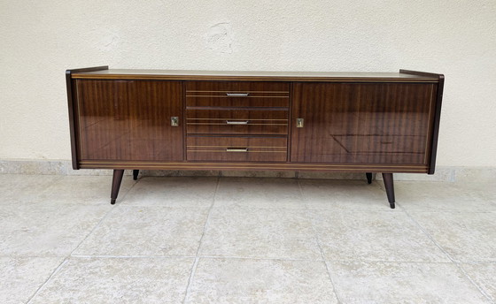 Credenza vintage in mogano risalente agli anni '60, composta da due ante e tre cassetti. Dimensioni: H65 L165 P45