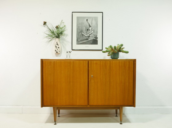 Questa credenza è un originale degli anni '60. È composta da due elementi. La sezione del mobile a forma di parallelepipedo poggia su un cavalletto con quattro gambe affusolate. Le superfici del mobile sono impiallacciate in noce. La chiave è inclusa. Dietro le due ante doppie si trova uno spazio contenitivo diviso da un ripiano in legno. Le altezze utili sono 22 e 24 cm. ➡️ Un po' di storia: la credenza fu prodotta per la prima volta il 16 agosto 1961 con il nome di "Mobile da soggiorno modello 579/31". Fu prodotta da VEB Oberlausitzer Möbelwerke Neugersdorf in Germania. ➡️ Dimensioni: 101 cm x 40 cm x 73 cm (larghezza x profondità x altezza)