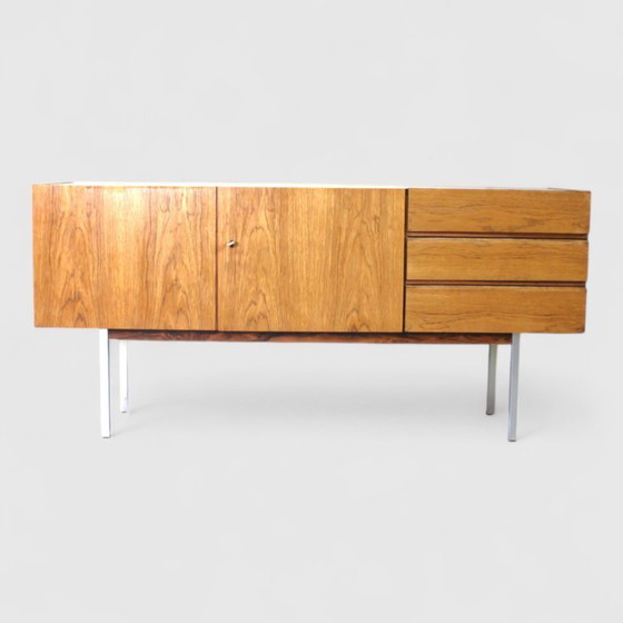 Questa credenza di metà secolo, risalente agli anni '70, si adatta perfettamente a un arredamento moderno o eclettico. Le venature del legno scuro e le gambe in metallo la rendono un modello senza tempo. Questo mobile vintage contiene tre cassetti e due ante. Le ante possono essere chiuse con una chiave e dietro di esse c'è un ripiano rimovibile.