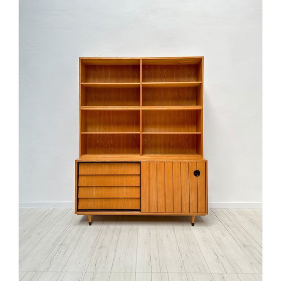 Bellissima credenza vintage con contenitore superiore originale degli anni '50, disegnata da Erich Stratmann per Oldenburg Möbelwerkstätten. Realizzata in legno di frassino con dettagli neri. Condizioni ben conservate con segni d'uso dovuti all'età.