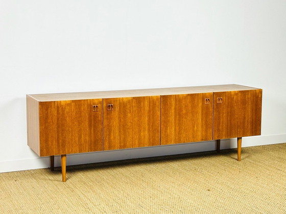Credenza vintage scandinava in teak risalente agli anni '60, con quattro ante minimaliste.