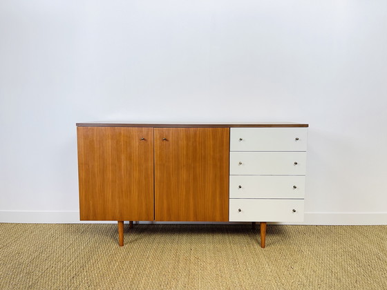 Credenza vintage scandinava in teak degli anni '60, composta da due ante e quattro cassetti. Cassetti verniciati di bianco. Dimensioni: H85 L150 P40