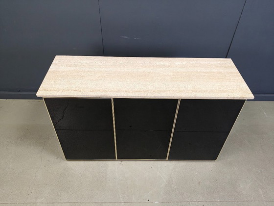 Lussuosa credenza laccata nera con ferramenta in ottone e splendido piano in travertino.