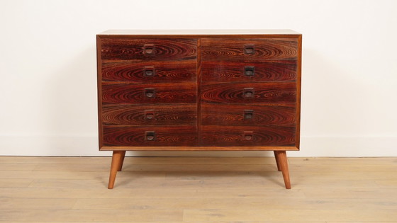 Questa credenza vintage è davvero bella da vedere! La credenza è realizzata in palissandro e dispone di 10 cassetti; 5 cassetti per lato. La credenza vintage proviene dalla Danimarca. La credenza ha un aspetto pazzesco grazie al colore caldo del palissandro e alle bellissime maniglie intarsiate. Questo comò si adatta perfettamente agli interni di metà secolo o vintage.