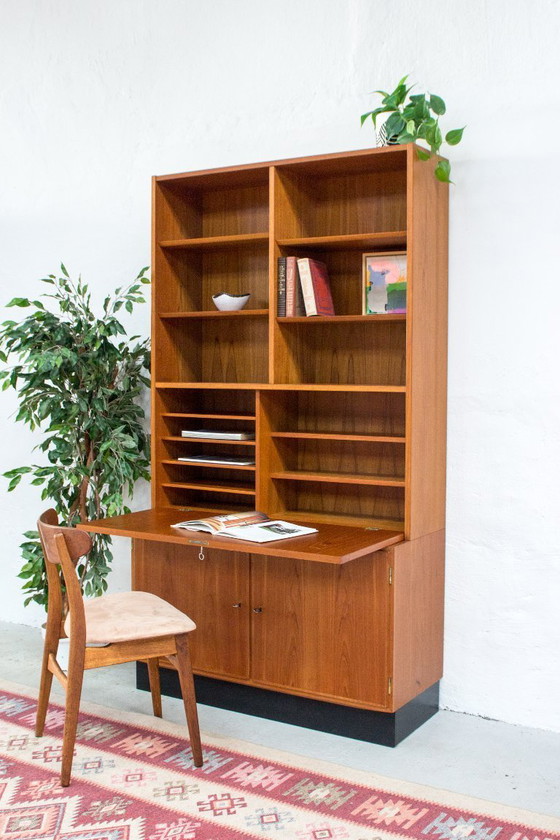 Scrivania semplice e funzionale di Hundevad, prodotta in Danimarca. Questo mobile combina linee pulite con un caldo colore teak e può essere utilizzato in vari modi: come postazione di lavoro, libreria o semplicemente come un bel posto tranquillo nella stanza. Il vano può essere aperto sul davanti e funge da pratica superficie di scrittura. Quando è chiuso, il bureau ha un aspetto sobrio e ordinato. I ripiani aperti offrono spazio per libri, cartelle o oggetti personali, mentre la sezione inferiore offre ulteriore spazio di archiviazione dietro due ante. Nella parte sinistra si trovano altri piccoli cassetti per tenere in ordine gli oggetti. Tutti i ripiani sono regolabili in altezza. Lo zoccolo è stato verniciato di nero, il che conferisce a questo mobile un aspetto molto particolare e moderno. Sono presenti solo lievi segni di usura dovuti all'età.
