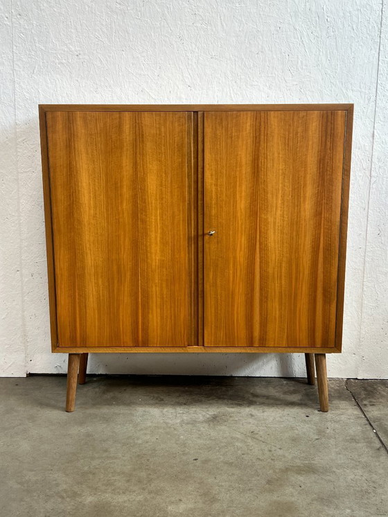 Divertente ed elegante credenza a due ante apribili realizzata dalla tedesca WK Möbel negli anni Settanta. Il mobile poggia su gambe affusolate e presenta due ripiani regolabili all'interno. È anche marcato. Il mobile è corredato della chiave originale. In buone condizioni, con solo alcuni leggeri segni d'uso dovuti all'età.