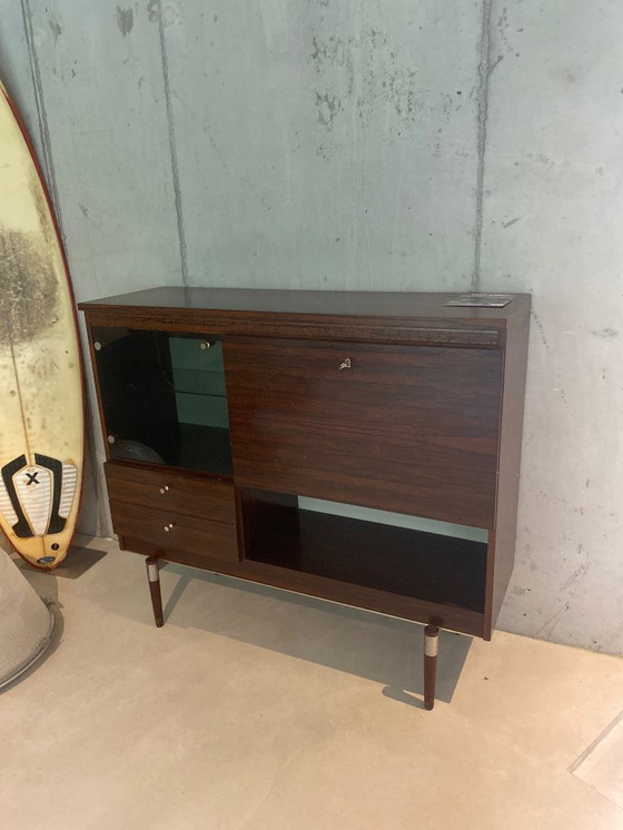 La silhouette slanciata su gambe affusolate con inserti in metallo è tipica del periodo modernista di metà secolo. La chiave originale è inclusa. Il mobile è in buone condizioni vintage, con visibili segni di usura coerenti con la sua età e autenticità.