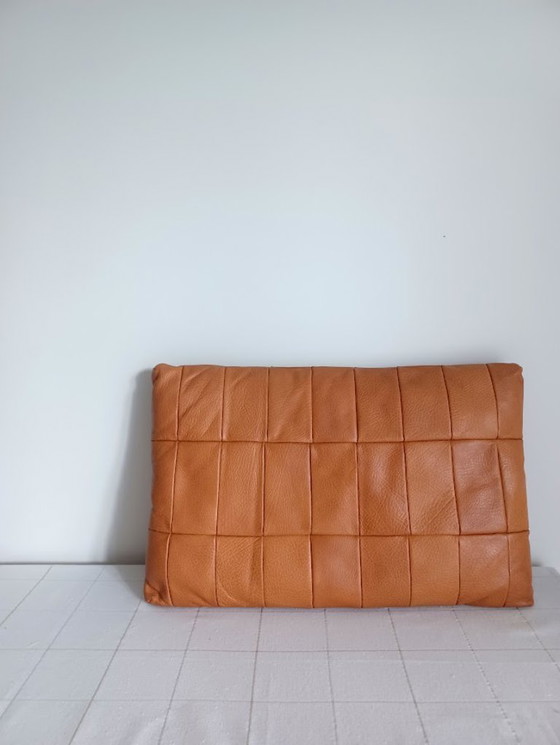 Cuscino vintage in pelle color cognac chiaro. Metà secolo.