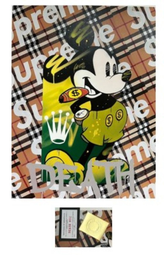 Serigrafia originale del famoso street artist DEATH NYC (New York). Mickey Mouse Rolex Tecnica: serigrafia su carta d'arte pesante Anno: 2020 Edizione: ogni opera di un'edizione limitata, firmata a mano, numerata e timbrata a secco Dimensioni: circa 45 × 32 cm ciascuna Include: certificato ufficiale di autenticità (COA) con sigillo Condizione: nuovo, mai incorniciato Provenienza: direttamente dall'editore a New York, con COA originale.