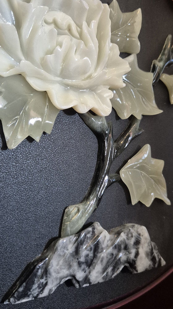 Scopri questa splendida decorazione da parete con una raffinata cornice in pietra preziosa. I delicati fiori e le foglie sono scolpiti con cura nella pietra, creando un'opera d'arte elegante e senza tempo. Perfetta per chi desidera aggiungere un tocco di bellezza naturale ai propri interni.