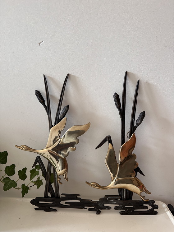 Quanto è bello questo? Due graziosi cigni in ottone in pieno volo, circondati da un metallo nero ribattuto - davvero molto anni '70. Bellissimo oggetto da parete stratificato con una fresca alternanza di lucido e opaco, ideale per attirare l'attenzione sulla parete. In ottime condizioni vintage, con leggeri segni d'uso. Q230