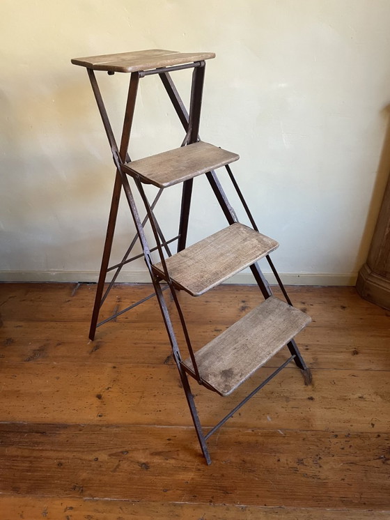 Una scala unica e affascinante proveniente dalla Francia. È un modello robusto grazie alla sua struttura in ferro. I gradini sono realizzati in pregiato legno di faggio. Questa scala è pieghevole. È anche molto utile come elemento decorativo in una vetrina per esporre la vostra merce, o in casa, ad esempio in una veranda con piante, grazie ai suoi gradini profondi. Aggiunge davvero un tocco di atmosfera. La scala è stata trattata contro i tarli ed è in buone condizioni. Altezza da chiusa: 128 cm. Altezza come scala: 104 cm. Larghezza superiore: 30,5 cm. Larghezza inferiore: 52 cm. Profondità inferiore da aperta: 75 cm. Gradino superiore: 30,5 x 26,5 cm.