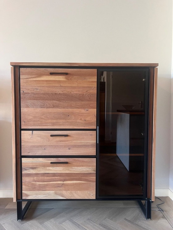 - L'estetica industriale è esaltata dagli accenti in metallo nero, che conferiscono un tocco contemporaneo al mobile.