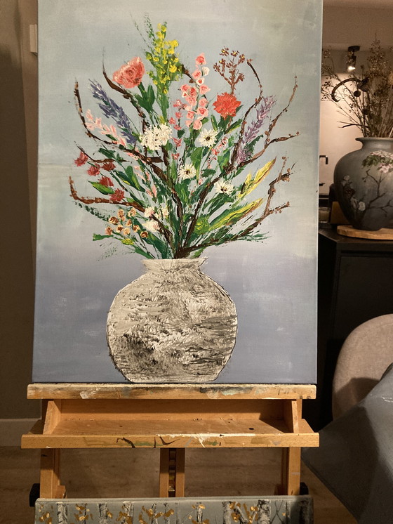 Questo splendido dipinto cattura la vibrante bellezza dei fiori selvatici, elegantemente disposti in un vaso. L'uso di colori vivaci e pennellate dinamiche dà vita al bouquet, rendendolo un incantevole punto focale in qualsiasi ambiente. Il vaso grigio crea un sottile contrasto, facendo risaltare ancora di più le tonalità vibranti dei fiori.