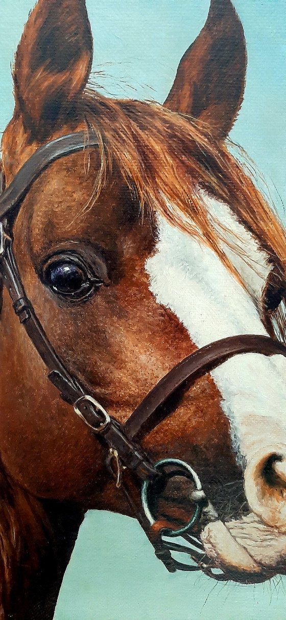 Dipinto raffigurante una testa di cavallo altamente realistica, olio su tela.