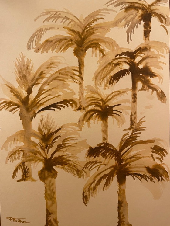 - Quest'opera d'arte, realizzata su carta, illustra con delicatezza e sobrietà la bellezza delle palme sotto un cielo crepuscolare.