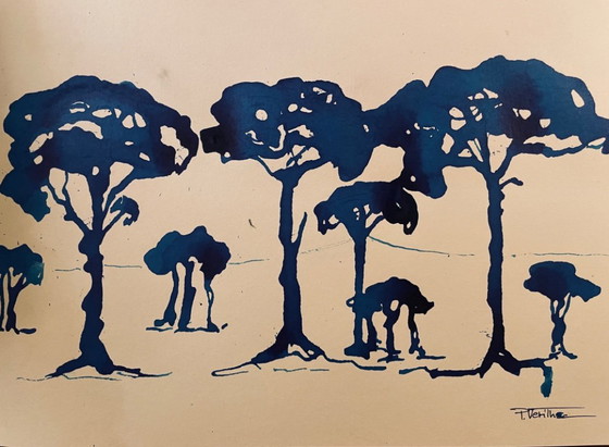 Scopri questo acquerello monocromo intitolato "Pine Forest at Dusk", un'opera che cattura l'essenza serena di una pineta al calar della notte. La semplicità del blu intenso contrasta magnificamente con lo sfondo beige, evocando un'atmosfera di calma e contemplazione.