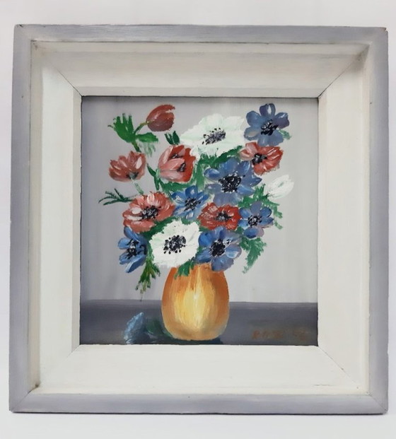 Dipinto ad olio d'epoca su pannello di truciolato, raffigurante fiori in un vaso
