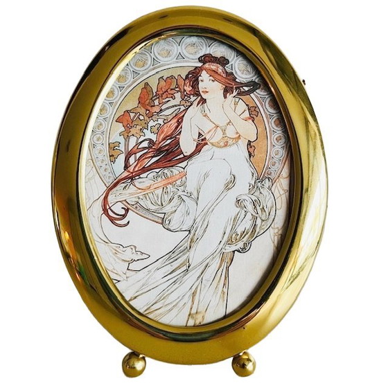 Dipinto Art Nouveau vintage di Alphonse Mucha, cornice ovale in ottone con marchio The Arts Music Hallmark, anni '60