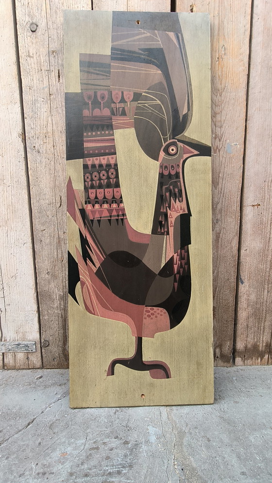 Pannello in legno vintage con illustrazioni stilizzate di galli in stile Mid-Century Modern. Questi tipi di design erano popolari negli anni '50 e '60 e venivano spesso creati da artisti come Shag o ispirati all'arte popolare scandinava o dell'Europa orientale. Potrebbero aver avuto origine nella Germania occidentale, in Danimarca o in un altro paese con una forte tradizione di design di quel periodo. Presenta qualche danno sul lato destro e alcuni graffi. Vedi foto. Ma nel complesso, ha ancora un bell'aspetto. Ho un secondo gallo in un altro annuncio.