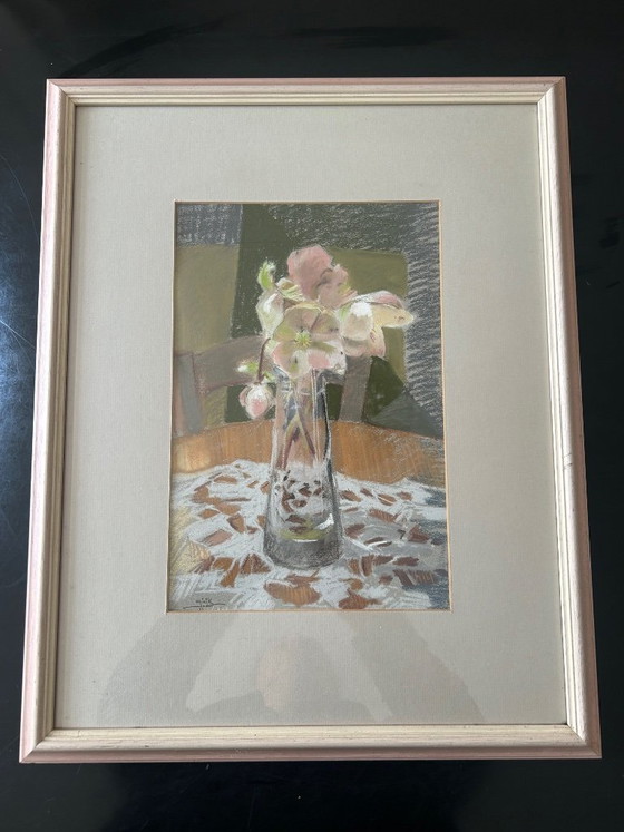 Disegno a pastello a olio sotto vetro, firmato da Jodor Minik, pittrice francese originaria del sud della Francia, descritta come un'artista itinerante per la varietà delle sue opere.