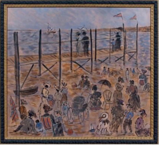 Olio originale su tavola, firmato e incorniciato, del pittore postimpressionista francese Henry Saint-Clair (1899-1990), intitolato "Scena di spiaggia animata".